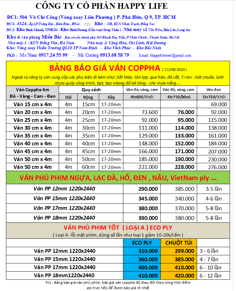 | Tư vấn về chất lượng, kỹ thuật ván phủ phim miễn phí, liên hệ Mr. Cường 0913. 68 58 79 | ||||||||