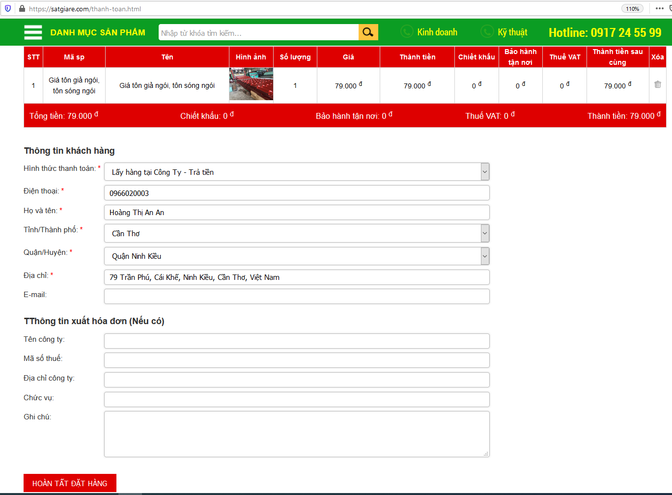 Bước 3: Sau khi chọn đủ hàng hóa mình cần quý khách nhấn nút “ĐẶT HÀNG” để nhập thông tin khách hàng.